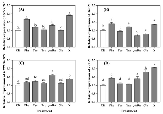 Relative expression of GTPCHI (A), ADCS (B), HPPK/DHPS (C) and FPGS (D) under treatments of different amino acid. CK was wheat seedlings cultured with distilled water; Phe, Tyr, Trp, pABA, and Glu were seedlings cultured with 1.00 mM phenylalanine, 0.25 mM tyrosine, 0.50 mM tryptophan, 0.25 mM p-aminobenzoic acid, and 1.00 mM glutamate, respectively; X was seedlings cultured with the optimized culture solution (1.50 mM phenylalanine, 0.50 mM tyrosine, 0.50 mM tryptophan, 0.75 mM p-aminobenzoic acid, and 0.50 mM glutamate). a–d represent significant differences among treatment factors (p < 0.05).