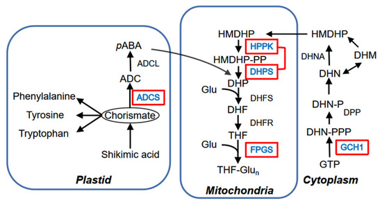 Folates play a pivotal role in the primary metabolism of nearly all organisms by functioning as C1-donors or acceptors, and their synthesis in plants can be divided into three steps: pterin synthesis, pABA synthesis, and assembly of these two moieties [14]. As shown in Figure 5, the biosynthesis of pterin branch is conducted in the cytosol, which is initiated by GTPCHI and forms 6-hydroxymethyldihydropterin, while pABA is synthesized from chorismite in plastids, which is initiated by ADCS [10]. Pterin and pABA moieties are condensed in mitochondria, which is initiated by HPPK/DHPS and the polyglutamylation of the resulting folate catalyzed by FPGS is the final step [15].