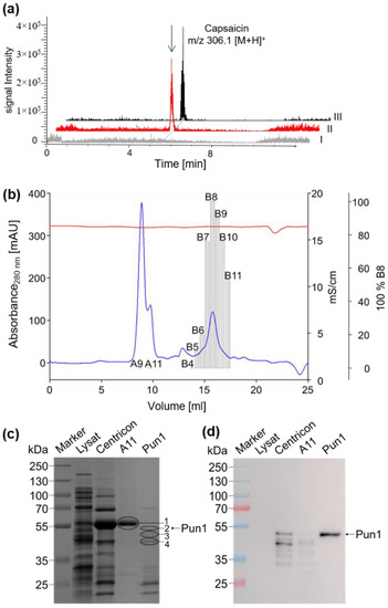 For the recombinant enzyme production, we selected the published sequence from Capsicum chinense [7] and codon-optimized this sequence for its expression in E. coli. Among several E. coli strains, IPTG-inducible SoluBL21 cells were chosen and proposed for the expression of problematic enzymes, specifically BAHDs [14]. Lowering the growth temperature from the usual 37 °C to 25 °C resulted in a small amount of product formation already in a crude extract. The identification of the product as capsaicin was based on an LC-ESI/MS performed in positive ionization mode. The signal was identical in terms of retention time, molecular mass m/z 306.1 [M + H]+, and retention time with a commercially available capsaicin standard (Figure 1a and Figure S1). In the crude extracts, we only measured trace amounts of active protein (Figure 2a) that could not be detected by an anti-His-tag antibody. The identification of a protein band on the SDS-PAGE that corresponded to the recombinant capsaicin synthase required additional purification steps to select a single protein band that was consistent with the activity profile. After affinity chromatography of the His-tagged protein and subsequent concentration of the extract, the fraction containing recombinant capsaicin synthase activity was further purified by size exclusion chromatography (SEC) (Figure 2b). Once more, this did not yield pure protein but resulted in a distinct signal that could be detected by the anti-His antibody among a mix of three candidate bands of a similar mass between 45 kDa and 52 kDa (Figure 2c,d). This protein fraction produced capsaicin from trans 8-methyl-6-nonenoyl-CoA and vanilloylamine and was used for subsequent functional characterization (Figure 2c,d). At this stage, it was confirmed that the enzymatic activity was consistent with a molecular mass of a monomeric enzyme of around 50 kDa. In order to identify the correct enzyme among the three dominant bands of 52 kDa, 50 kDa, and 48 kDa (Figure 2c), of which only the top one showed a signal with the anti-His-tag antibody, all of the bands were eluted from the gel, subjected to trypsin digestion, and the peptides were subsequently analyzed by LC-MS.