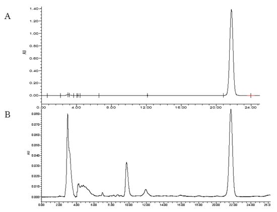 (A) HPLC chromatogram of psoralen standard. (B) HPLC chromatogram of psoralen in F. tikoua fruit.