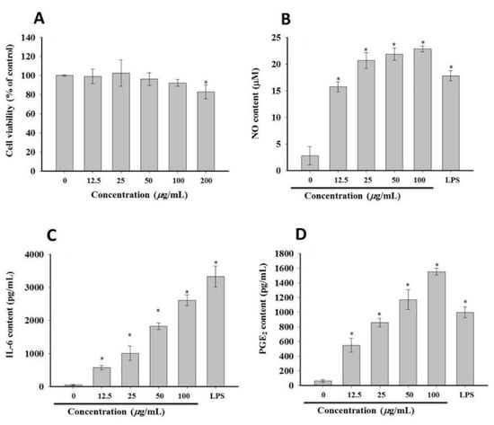 Effect of polysaccharide on the production of inflammatory mediators. (A) RAW 264.7 cells treated with different concentrations of polysaccharide, and cell viability was evaluated by MTT assay. (B–D) The NO content was detected by Griss reagent assay, and IL-6 and PGE2 was evaluated by commercial kit. * p < 0.05 vs. control group.