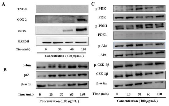 NF-κB is a ubiquitous transcription factor, and the transcription subunit p65 is a key factor involved in the activation of pro-inflammatory cytokines (e.g., iNOS, IL-6, and TNF-α) [31]. Once activated, NF-κB is translocated to the nucleus and modulates the expression of target genes [30]. As shown in Figure 5B, polysaccharide stimulation rapidly enhanced the levels of c-Jun and p65 within 10 min and reached its maximum level at 30 min, 1 h, and 3 h, respectively. Therefore, polysaccharide significantly decreased the expression of c-Jun and p65 proteins in the cytoplasm and increased the translocation of c-Jun and p65 to the nucleus.