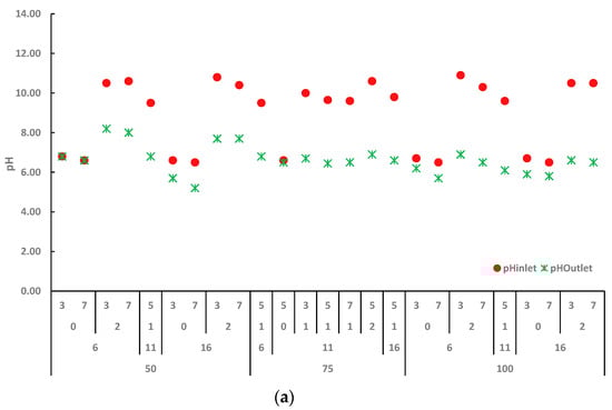Since the Ca(OH)2 is applied in the range of 0–2% in the pretreatment experiments, it is expected that changes in the pretreatment inlet and outlet pHs depend on the applied amount of Ca(OH)2. As can be seen in Figure 1a, the pH values of the variety of Shawnee switchgrass that were not pretreated with Ca(OH)2 at the reaction temperatures of 50, 75, and 100 °C were measured close to each other before and after the pretreatment experiments. While initial pH values were measured as 6.5–6.7, pH values varied between 5.2 and 6.7 depending on solid loading and reaction time after the pretreatment. In the pretreatment experiments assisted with 2% Ca(OH)2, the initial pH values ranged from 10.3 to 10.9. At the end of the reactions, at low temperatures (50 °C), pH values changed in the range of 7.7–8.2 depending on the pretreatment reaction time, while at high temperatures (100 °C), it changed between 6.5 and 6.9 regardless of the reaction time. When 1% Ca(OH)2 was applied in the pretreatments, the initial pH values were 9.5–9.8, while pH values were measured as 6.1–6.8 after the pretreatment. The pH values were observed to be lower at high temperatures.