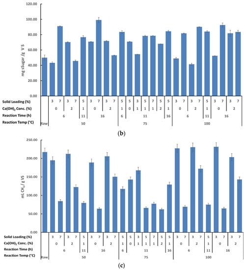 Thomas et al. [41] indicated that alkaline pretreatments have a variety of effects, such as (i) delignification, which results in the unmasking of cellulose, (ii) the breakdown of hemicellulose and cellulose, and (iii) a reduction in crystalline cellulose. pH, sSugar, and BMP analyses were carried out on raw and pretreated Shawnee switchgrass to observe the pretreatment effect. pH, sSugar, and BMP results of Ca(OH)2-assisted thermal pretreatment experiments are shown in Figure 1a–c, respectively.
