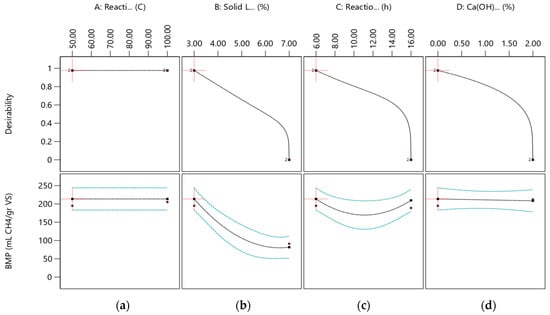The individual effects of independent variables of Ca(OH)2 assisted thermal pretreatment process on BMP and desirability (0.977) are presented in Figure 2. The individual effect of each independent variable on the BMP model presents that 179–236 mL CH4 gVS−1 should be produced by the application of 3% solid loading, 6 h reaction time, and 0% Ca(OH)2 concentration conditions in the pretreatment process. As is seen in Figure 2, the BMP value is observed to be stable between the 50 and 100 °C reaction temperature. On the other hand, BMP values decrease from 231.4 to 81.6 mL CH4 gVS−1 by increasing solid loading from 3% to 7%. Furthermore, increasing solid loading, reaction time, and Ca(OH)2 concentration resulted in low desirability and BMP values.