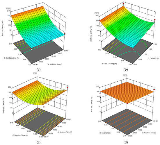3D response surface plots for the effects of independent variables on the BMP model are given in Figure 3a–d. In the interaction effect of solid loading and reaction temperature presented in Figure 3a, the maximum BMP value was reached only at the lowest solid loading of 3%. The graph also indicates that temperature change did not affect the BMP value where solid loading is kept constant, but the drops in solid loading value remarkably caused a rise in BMP values.