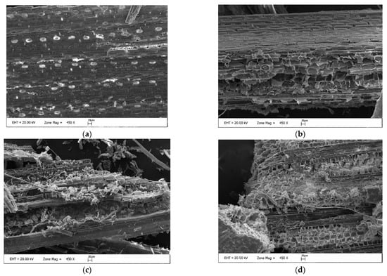 SEM images and the FTIR analysis of the raw and pretreated switchgrass samples were performed to appraise the alterations in surface properties and the structural-chemical modifications that emerged during the Ca(OH)2-assisted thermal pretreatment process. SEM images of raw switchgrass sample (a), pretreated switchgrass samples at 3% SL, 50 °C, 0% Ca(OH)2, 6 h, (b), 3% SL, 100 °C, 2% Ca(OH)2, 16 h (c), and 3% SL 100 °C, 0% Ca(OH)2, 6 h (d) are presented in Figure 4.
