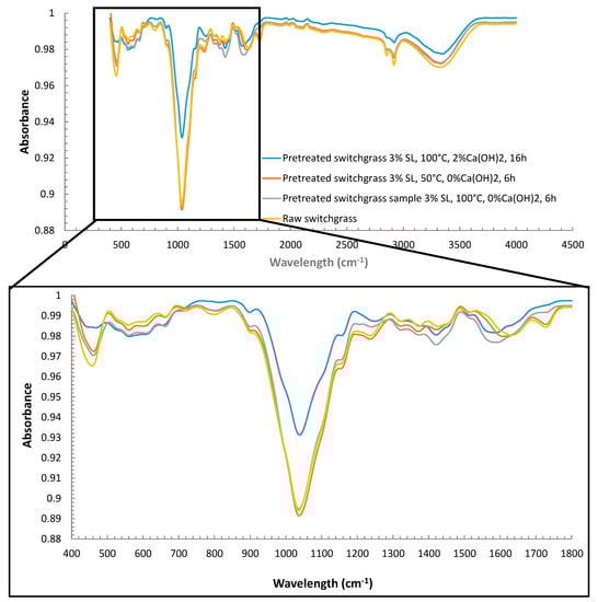 FTIR spectra of raw switchgrass sample, Pretreated switchgrass sample 3% SL, 50 °C, 0% Ca(OH)2, 6 h, Pretreated switchgrass sample 3% SL, 100 °C, 2% Ca(OH)2, 16 h, and Pretreated switchgrass sample 3% SL, 100 °C, 0% Ca(OH)2, 6 h.