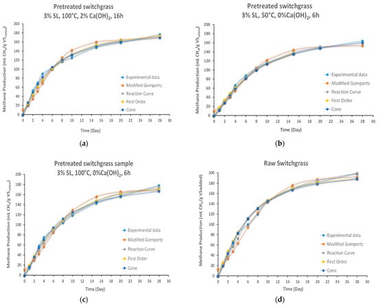 Compared to the untreated raw switchgrass (λ: 3.1 d and μm: 1.9 mLSTP gVS−1 d−1), while λ decreased, the μm value increased by the pretreatment. In this study, parallel with the literature, the Rm value increased, and the λ value decreased obtained from the reaction curve and modified Gompertz models compared to raw by applying 3% SL, 100 °C, 2% Ca(OH)2, 16 h pretreatment condition.