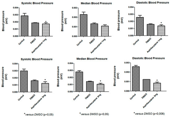 Indole alkaloids are the main secondary metabolites produced in Aspidosperma and are responsible for most of the biological activities reported in the genus, including antihypertensive activity. An intravenous infusion of the alkaloid Aspidocarpine (1 and 3 mg/kg) was administered in rats to investigate whether this compound can cause changes in blood pressure. After the administration of a 1 mg/kg infusion of Aspidocarpine, systolic and diastolic pressures were significantly reduced in relation to the negative controls and a positive control (DMSO), and after the administration of a 3 mg/kg infusion, all the parameters analyzed were significantly reduced in relation to the negative controls and a positive control (DMSO) in Wistar rats at a 5% probability (Figure 2).