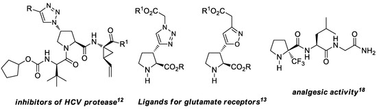 - Karoyan, P.; Sagan, S.; Lequin, O.; Quancard, J.; Lavielle, S.; Chassaing, G. Substituted prolines: Syntheses and applications in structure-activity relationship studies of biologically active peptides. Targets Heterocycl. Syst. 2004, 8, 216–273. [Google Scholar] [CrossRef]