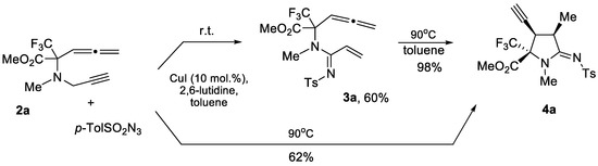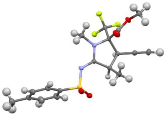 In continuation of our long-term program on the synthesis of new fluorinated amino acids using the transition-metal catalyzed transformation of the unsaturated precursors [30,31,32,33,34], we tested the Cu(I)-catalyzed [3 + 2] cycloaddition reaction of allenyne 2a with tosylazide, and we initially planned to obtain the corresponding allene-containing 1,2,3-triazole for the investigation of its further chemical behavior, keeping in mind that 1,2,3-triazoles with an electron-withdrawing aryl sulfonyl group on nitrogen are able to form extremely reactive carbenoid species under metal catalysis [35,36,37,38,39]. However, during the course of screening the optimal conditions and catalytic systems, the formation of CF3-substituted proline derivative 4a was unexpectedly revealed in a good yield and had an excellent diastereoselectivity (Scheme 2). The only diastereomer 4a was easily isolated in its pure form via column chromatography on silica gel; its structure was unambiguously confirmed by NMR-spectroscopy (1H, 13C and 19F) and X-ray analysis (Figure 2). The best yield of proline 4a (62%) can be achieved by heating equimolar amounts of reagents in toluene at 90 °C in the presence of CuI (10 mol%) and 2,6-dimethylpyridine (1.5 equiv.) as a base for 8 h. The usage of other copper catalysts (CuBr, CuTC, cationic complex Cu(MeCN)4PF6), organic bases (Et3N, DIPEA and pyridines) and solvents (DCE, chloroform and dioxane)) leads to a significant decrease in the product yield.