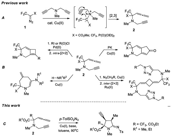 Recently, we elaborated on a straightforward way to access functionalized allenynes 2 based on the [2,3]-sigmatropic rearrangement of propargyl-containing nitrogen ylides generated in situ from α-CF3-diazo Compounds 1 and N,N-bis(propargyl)methylamine (Scheme 1A) [26]. Allenynes 2 have proved to be unique doubly unsaturated synthons that can afford a variety of the corresponding α-amino acid derivatives. Thus, the potential of 2 has been clearly revealed in their synthetic transformation under transition metal catalysis, e.g., during Pd-catalyzed Sonogashira coupling followed by intramolecular [2 + 2] cycloaddition [27] and a co-mediated Pauson–Khand reaction [26], Cu-catalyzed tandem amination/cyclization [28] and in intermolecular Ru-catalyzed dimerization [29] (Scheme 1B). Now we wish to disclose a highly diastereoselective pathway to new densely functionalized proline derivatives via a cascade reaction between allenynes 2 and tosylazide, which is involved in Cu(I)-catalyzed alkyne-azide [3 + 2]-cycloaddition, ketenimine rearrangement and Alder-ene cyclization (Scheme 1C). To the best of our knowledge, this type of 1,6-allenyne transformation under metal catalysis to access proline derivatives has been not reported before.