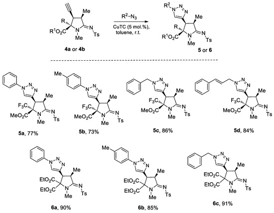 The presence of an ethynyl group in the structure of prolines 4a,b makes them unique synthons for further useful transformations. For instance, 3-ethynyl substituted prolines and their triazole-containing derivatives have been recently applied as universal building blocks for the development of new ligands for the activation of ionotropic glutamate receptors, which are important excitatory neurotransmitters in the central nervous system [13,46]. Therefore, in order to demonstrate one of the possible synthetic utilizations of the new compounds 4a,b, we investigated their Cu(I)-catalyzed alkyne-azide coupling, i.e., the so-called “click” reaction, with alkyl and aryl azides. For these purposes, a series of copper (I)/organic base systems were tested to activate the reaction. As a result, it was revealed that the optimum condition providing the best yields of the target triazoloprolines 5 and 6 was the usage of copper thiophene-2-carboxylate (CuTC) in amounts of 5 mol.% in the absence of any base. The reaction went to completion at room temperature in toluene for 4 h (Scheme 5).