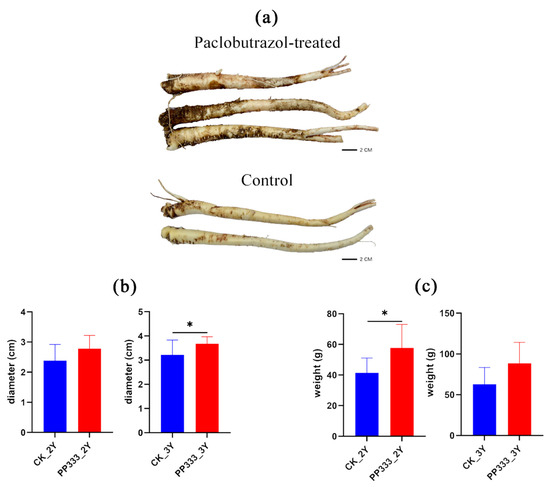 Influences of paclobutrazol (PP333) on root diameter. (a) Diameter (b) and weight (c) of Platycodon root. Data are presented as mean ± SD (n = 10). Significant differences were shown as * p < 0.05. CK_2Y and PP333_2Y represent control and paclobutrazol-treated group of 2-year-old Platycodon roots, respectively. CK_3Y and PP333_3Y represent control and paclobutrazol-treated group of 3-year-old Platycodon roots, respectively.