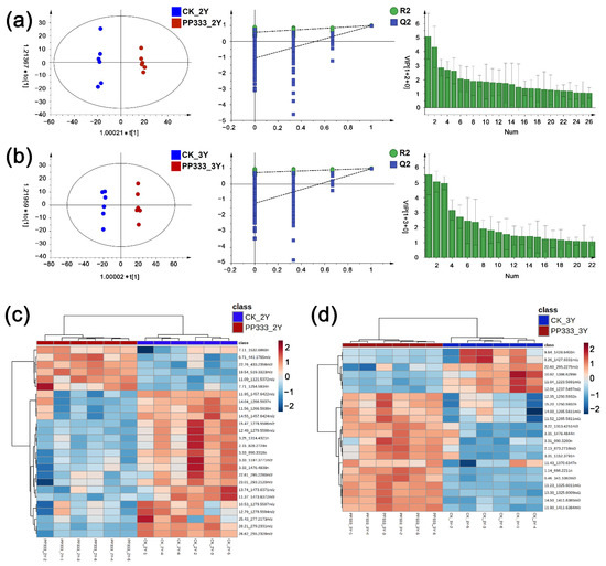 OPLS-DA score plots, permutation tests, VIP plots and heatmaps of the metabolome analysis in 2-year-old (a,c) and 3-year-old (b,d) Platycodon roots.