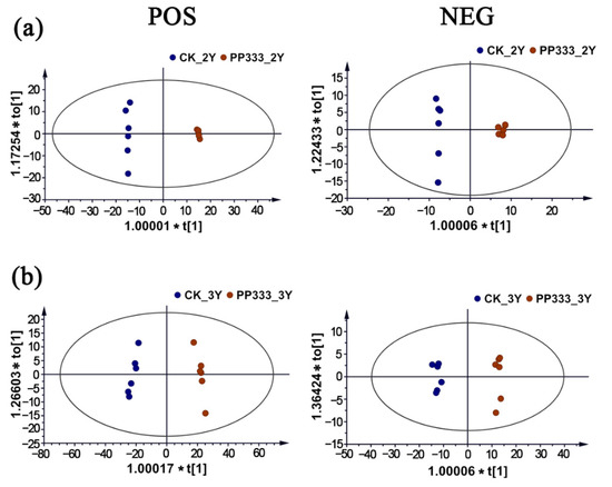 OPLS-DA score plots of the lipidomic analysis in 2-year-old (a) and 3-year-old (b) Platycodon root.