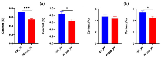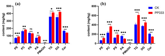 Level of lipids in 2-year-old (a) and 3-year-old (b) paclobutrazol (PP333)-treated and untreated Platycodon roots. Each value is shown as mean ± SD (n = 6). * indicates significant difference p < 0.05. ** indicates significant difference p < 0.01. *** indicates significant difference p < 0.001. ns: no significance.