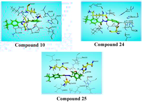 Three dimensional interaction of compounds 10, 24, 25, with active site residues of urease. Ligands are shown in green, key residues of the active site are shown in yellow stick mode, hydrogen bonding and other interaction is shown in dark color dotted lines.