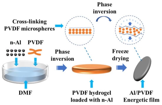 - Chen, S.; Yu, H.; Zhang, W.; Shen, R.; Guo, W.; DeLuca, L.T.; Wang, H.; Ye, Y. Sponge-like Al/PVDF films with laser sensitivity and high combustion performance prepared by rapid phase inversion. Chem. Eng. J. 2020, 396, 124962. [Google Scholar] [CrossRef]