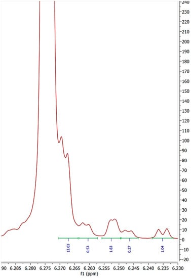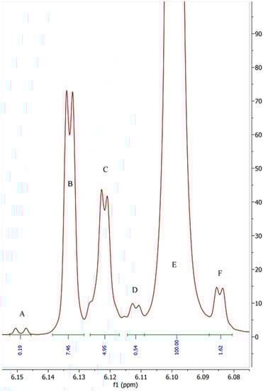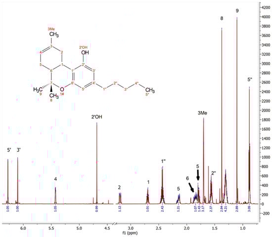 The presence of four extraneous doublet peaks, all with J values of 1.6–1.7 Hz suggests that these peaks may well be equivalent protons on isomers of Δ-8 THC or some other form of cannabinoid. All other samples show similar impurities with the expanded spectral excerpts available in the Supplementary Materials (Sample S3). Peaks “A” and “D” in Figure 3 may potentially belong to compounds 1 and 2 described by Radwan [5]. Though the relatively congested peak area for carbon 3′ shows no clear peak of similar integral value at 6.27 ppm and 6.24 ppm, respectively (Figure 4).