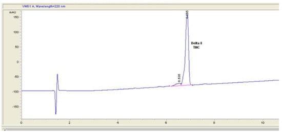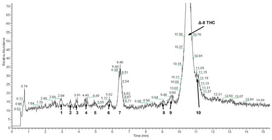Peak 8 with an [M + H]+ molecular ion of 315 Da is consistent with MS2 spectra of THC or CBD. However, due to the longer retention time of 9 min compared to a retention time of 6.46 min for CBD and the slightly longer retention time for Δ-8 THC of 10.5 min, it would appear to be a CBD or THC isomer.