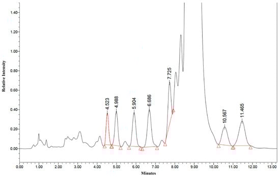 HPLC chromatogram of sample 6 performed during this study. A wavelength of 210 nm was used for the UV detector. The red triangles mark the range of a peak for integration.