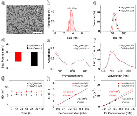 (a) TEM image and (b) size distribution of PEGylated Fe3O4-Mal nanoparticles. (c) Hydrodynamic size distribution and (d) zeta potential values of Fe3O4-Met-Cy5.5 and Fe3O4-Cys-Cy5.5. (e) Ultraviolet–visible absorption spectra of Fe3O4-Met-Cy5.5 and Fe3O4-Cys-Cy5.5, with a Fe concentration of 50 μg mL−1. (f) Fluorescence spectra of Fe3O4-Met-Cy5.5 and Fe3O4-Cys-Cy5.5, with a Fe concentration of 50 μg mL−1 acquired at 705 nm upon excitation at 635 nm. (g) The hydrodynamic size variation of Fe3O4-Met-Cy5.5 and Fe3O4-Cys-Cy5.5 incubated in PBS for 120 h. Linear regression fitting of the longitudinal (h) and transverse (i) relaxivities of Fe3O4-Met-Cy5.5 and Fe3O4-Cys-Cy5.5 for extracting r1 and r2.