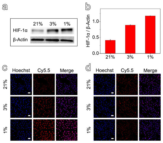 To investigate the efficacy of the prepared nanoprobes in detecting hypoxic environments, MCF-7 cells with different hypoxic states were first obtained by incubating the cells under different oxygen concentrations for 12 h. Then, the expression of HIF-1α was evaluated by Western Blot assays. As shown in Figure 2a,b, it was verified that the cells cultured in 3% and 1% O2 could establish hypoxic cell models for further experiments. Anyway, the protein expression values for the cells cultured under 1% and 3% O2 were 2.9 and 2.2 times higher than that of 21%, respectively.