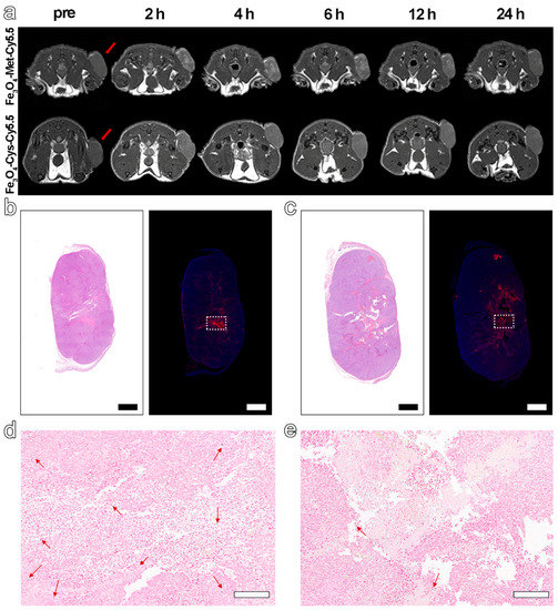 (a) T1-weighted MRI of tumor-bearing mice within 24 h, before and after injection with Fe3O4-Met-Cy5.5 or Fe3O4-Cys-Cy5.5. H&E staining (left) and immunofluorescence staining (right) for tumors of mice injected with Fe3O4-Met-Cy5.5 (b) or Fe3O4-Cys-Cy5.5 (c) (scale bars represent 1000 μm). Prussian blue staining of hypoxic area (dashed area on immunofluorescence staining images) in the tumors of mice treated with Fe3O4-Met-Cy5.5 (d) or Fe3O4-Cys-Cy5.5 (e) (scale bars represent 200 μm).