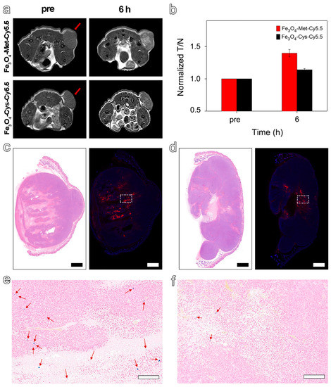 (a) T1-weighted MRI of tumor-bearing mice before (pre) and 6 h post-injection of Fe3O4-Met-Cy5.5 or Fe3O4-Cys-Cy5.5. (b) The MRI signals at the time before (pre) and after (6 h) injection of Fe3O4-Met-Cy5.5 or Fe3O4-Cys-Cy5.5. H&E staining (left) and immunofluorescence staining (right) for tumors of mice injected with Fe3O4-Met-Cy5.5 (c) or Fe3O4-Cys-Cy5.5 (d) (scale bars represent 1000 μm). Prussian blue staining of hypoxic area (dashed area on immunofluorescence staining images) in the tumors of mice treated with Fe3O4-Met-Cy5.5 (e) or Fe3O4-Cys-Cy5.5 (f) (scale bars represent 200 μm).