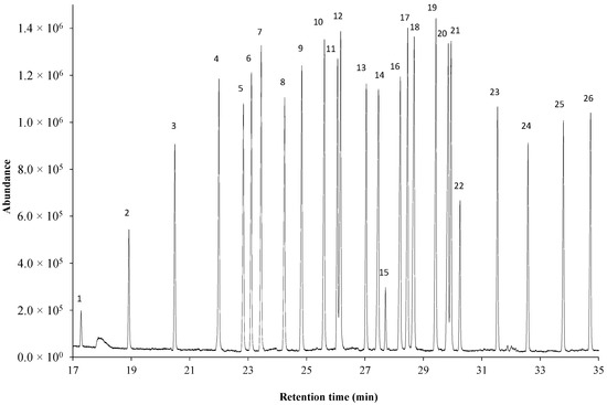 Fatty acids were analyzed in methyl ester forms by GC–MS. The total ion chromatograms were registered using an ionic liquid (IL)-based column with extremely high polarity (SLB-IL111, 60 m). The analytical method was validated by applying a 26-component-fatty-acid-methyl-ester mixture (Bacterial Acid Methyl Esters CP Mixture—BAME CP Mixture) as described in the Section 4. The separated methyl ester components were identified by their mass spectra, and Table 1 contains the list of the components by the order of the retention times. Figure 1 shows the total ion chromatogram of the mixture.