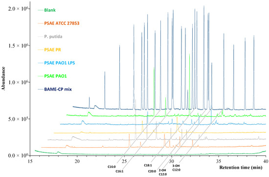 Total ion GC-MS chromatogram of Pseudomonas bacterial strains and PSAE PAO1 LPS, cultivated at 37 °C on agar cultivation media and on the first day of incubation, BAME CP Mixture and blank sample (the surface of the culture media without any bacteria) using the ionic liquid-based SLB-IL111 column. The main fatty acid components were indicated in the different samples. The optimized experimental conditions are given in Section 4.