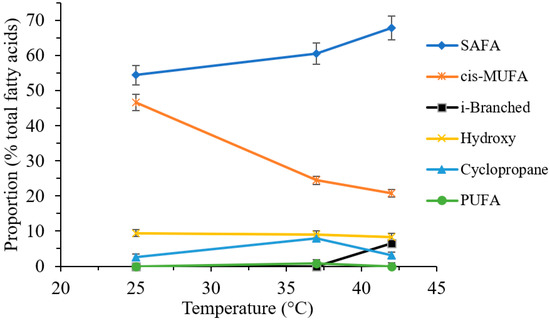 The cultures were incubated at three varying temperature levels: 25 °C, 37 °C and 42 °C using agar culture media. Changes in the total fatty acid composition upon different cultivation temperatures for all bacterial isolates studied are listed in details in Table 3 and the mean changes in the proportion of distinguished fatty acid groups, as a function of temperature, is presented in Figure 3.