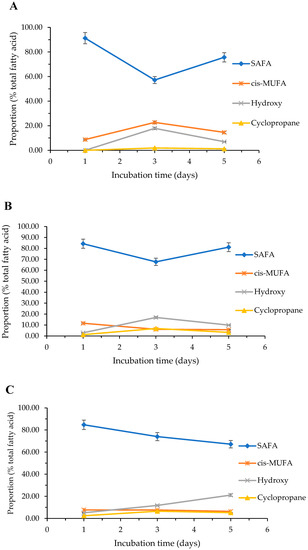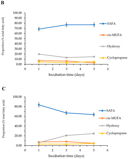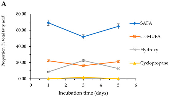 At 42 °C SAFAs gradually declined, while hydroxy fatty acids gradually increased over time. Cis-MUFAs showed an increasing trend between days 1 and 3, then a decrease between days 3 and 5 (Figure 4C). Finally, cyclopropane fatty acids remained stable over time.