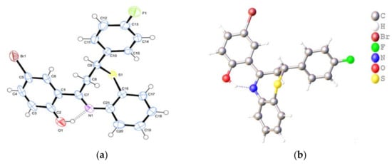 The 1H-NMR spectral splitting patterns and the vicinal coupling constant values of these compounds were used to investigate the conformational preferences of the dihydrobenzothiazepine ring in CDCl3 solution. The aliphatic region of the 1H-NMR spectra of these compounds at 400 MHz represents an ABX system with the two anisochronous protons of the methylene (CH2) group and the methine (CH) proton of the 7-membered heterocyclic ring, each resonating as a doublet of doublets (dd) in the regions δ 3.52–3.05–3.52 ppm and δ 4.99–5.02 ppm, respectively. The corresponding protons in the case of the 1H-NMR spectra of the analogous 4-(2,4-dibromo-1,3-dihydroxyphenyl)-substituted 2,3-dihydrobenzo[b][1,5]thiazepines acquired in CDCl3 at 500 MHz were previously reported to resonate as a doublet around δ = 3.32 ppm for the CH2 group and a triplet around δ = 4.98 ppm for the methine proton []. The methylene protons are chemically nonequivalent in any conformation of the dihydrobenzothiazepine system and couple with each other (Jgem), and each couples differently to the vicinal methine proton (Jvic ≠ Jgem). The set of multiplets corresponding to the aliphatic protons of the test compounds were assigned with the aid of 2D nuclear Overhauser effect spectroscopy (NOESY) and heteronuclear multiple-bond correlation experiment (HMBC) spectroscopy on 2d as a representative model (refer to Figure S2 in SI). A significant downfield shift of the resonance corresponding to HB to around δ 3.52 ppm is ascribed to the magnetic anisotropy of the parallel 1,2 and 4,5 bonds in analogy with the literature precedent for the 1,5-benzoheterazepine analogues []. The signal for the OH group resonates significantly downfield around δ = 14.60 ppm as a less intense and slightly broad singlet, which is consistent with the participation of this hydrogen atom in the intramolecular hydrogen-bond interaction with a nitrogen atom to form a six-membered chair-like pseudo-ring. The O–H stretching bands in the infrared spectra of the test compounds recorded using the thin-film method and represented in Figure S1 of SI, on the other hand, are generally inconspicuous, which is consistent with the definition of a strong intramolecular bond []. We were able to obtain single crystals of a representative compound 2b and the geometry of these compounds was distinctly confirmed using the XRD method.