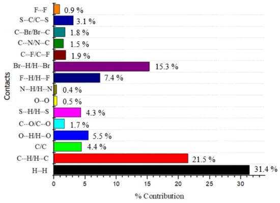 The Hirshfeld surface (Figure 4a) and shape-index surface plots (Figure 4b) of compound 2b were carried out using CrystalExplorer 17.5 software [] based on the corresponding Common Internet File’s (CIF’s) input to obtain information about intermolecular contacts and their quantitative contribution to the supramolecular self-assembly. The plots suggest that the intermolecular H···H contacts make up 31.4% of the Hirschfeld surface, and these are the highest contributing contacts in the crystal packing of this compound (see Figure 5). The reciprocal C⋯H contacts, which contribute 21.5% toward the Hirshfeld surface, are attributed to C−H···π interactions. The C···C contacts represent the hydrophobic π⋯π interactions and these produce a minor contribution (4.4%) to the compound’s crystal packing. The presence of consecutive triangular regions of red and blue around the aromatic rings on the shape-index surface indicates a π⋯π stacking interaction. The other reciprocal intermolecular contacts, such as Br⋯H/H⋯Br, F⋯H/H⋯F, O⋯H/H⋯O and S⋯H/H⋯S contacts, contribute 15.3, 7.4, 5.5 and 4.3% to the total Hirschfeld surface, respectively, which also reveals the importance of these contacts in the molecular packing of the studied compounds. The H···O/O···H contacts, due to nonclassical intermolecular C–H···O hydrogen bonds, constitute 5.5% of the Hirshfeld surface of this compound. The anisotropic electronic charge distribution around covalently bound fluorine has previously been found to give rise to a positive σ-hole in its outer portion and a weaker positive or negative belt around its lateral sides []. These make this atom work as an XB donor in the gas, solution and solid phases. Both of the fluorine atoms in F2 have been found to possess positive σ-holes, which are also present in some organofluoro compounds in which fluorine is bound to O, N and/or C atoms []. The present study revealed the existence of weak halogen bonds of the types C⋯F (1.9%) and C⋯Br (1.8%), in which the halogen atoms act as XB donors and π electrons as acceptors. The noncovalent interactions, such as halogen–halogen and halogen-bonding interactions, are of interest in medicinal chemistry, chemical biology, supramolecular chemistry and crystal engineering []. At least in our opinion, the various noncovalent interactions observed for the test compounds should be valuable for rational drug design and help in understanding interactions of these halogenated ligands with proteins.