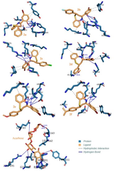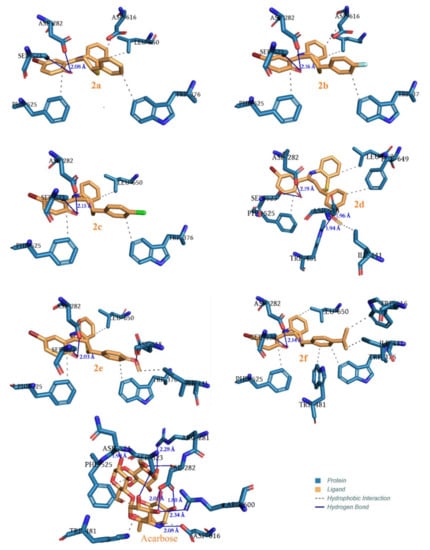 Molecular docking (in silico) was conducted on these benzothiazepine derivatives against both enzymes to predict plausible protein–ligand interactions at a molecular level. The active site of α-glucosidase is made up of the protein residues, Trp376, Asp404, Trp516, Asp518, Met519, Arg600, Asp616, Phe649 and His674 []. The analysis showed that the binding of compounds 2a–f with α-glucosidase is driven by hydrophobic interactions between the ligand and the protein residues Phe525 and Leu650, and hydrogen-bonding interactions with the residues Asp280 and Ser523 (Figure 8). Compound 2f is predicted to form the highest number (6) of hydrophobic interactions with α-glucosidase, which is consistent with its binding affinity and inhibitory effect against this enzyme. Although acarbose forms a relatively higher number of hydrogen bonds with α-glucosidase, its binding affinity was less than that of the test compounds, probably due to its hydrophilic tetrasaccharide architecture compared to 2f with a 4-(CH3)2CHC6H4- branch that provides hydrophobic contact with α-glucosidase.