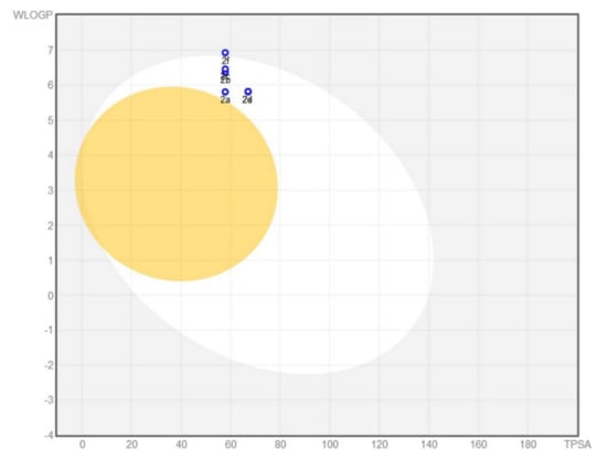 The Brain Or IntestinaL EstimateD permeation method (BOILED-Egg) for the prediction of the lipophilicity and polarity of compounds 2a–2f.