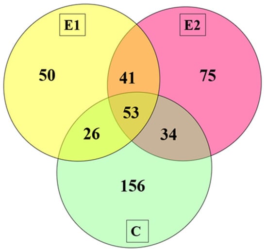 Venn diagram (E1 and E2—samples added with sodium nitrite at an amount of 50 mg/kg of stuffing and lyophilized willow herb extract at an amount of 150 and 1000 mg/kg, respectively; C—control sample added with sodium nitrite at an amount of 100 mg/kg of stuffing but not willow herbs.