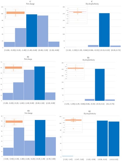 Figure 2 shows the values of the net charge distribution and the hydrophobicity of analyzed molecules. The net charge of peptides derived from the tested samples ranged from −5 to 4 (or 3 for E2), while most of the peptides had a net charge of around 0.0. For example, the net charge of LEDEVYAQKMKYKAISEELDNALNDITSL peptide from E1 was on average 0.017 with a minimum value of −5 and that of EALGDKAVFAGRKFRNPKAK was 4. The highest number of potentially anticancer peptides had a net charge of 0.4–2.2, which indicates that they were cationic peptides.
