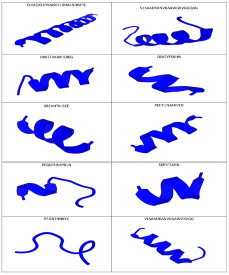 To examine the effect of particles’ structure on their biological activity on cancer cells, putative antitumor peptides were visualized, and 10 of them with the highest index of “anticancer probability” are shown in Figure 3. All selected molecular structures of the peptides were predicted using the PEP-Fold3 tool. The conformation of the peptides indicated different structures, irrespective of the sequence size. The bioactive sequences were embedded only in the random coil (as was the case with PFGNTHNKYK), but most of the potentially anticancer peptides assumed the α-helical conformation (Figure 3).
