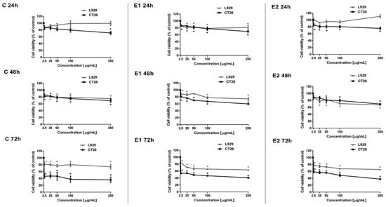 This assay is based on the ability of mitochondrial succinate dehydrogenase to reduce the yellow tetrazolium salt (MTT) to purple formazan crystals. As this activity is carried out by living cells, the measured absorbance is directly proportional to the quantity of live cells [27,28]. After multiplication and stabilization of cells (approximately 7–14 days), the culture reached at least 75% of confluence; after reaching confluence, the tested preparations were added to the cell culture in the final concentration (2.5, 25, 50, 100, and 250 µg/mL) and incubated for 24, 48, and 72 h. After this time, the cells were subjected to the MTT assay (MTT Cell Proliferation/Viability Cell Assay: BIOKOM analysis) in triplicate. The control well contained only cells (L-929 or CT-26) without the test preparation. The absorbance was measured using a microplate reader, and absorbance was measured at 570 nm (MULTISCAN FC, Thermo Scientific).