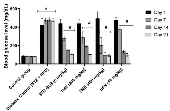 Blood glucose levels in normal control and STZ-induced diabetic rats of the treatment groups for day 1, day 7, day 14, and day 21 after the STZ administration are shown in Figure 2. Following STZ treatment, GLB, a standard drug (an insulin secretagogue), (6 mg/kg), TME (200 and 400 mg/kg) and UFN, the isolated compound, (50 mg/kg) were used as treatments in the different groups. Injection of STZ at 40 mg/kg with HFD showed a significant increase (p < 0.001) in blood glucose levels compared to control rats. On day 7, treatment with TME 400 mg/kg produced a remarkable decrease (p < 0.001) in blood glucose levels amongst all the five treatment groups. It even displayed a better reduction compared to the GLB-treated group. Additionally, on day 14, it showed also a better reduction profile in blood glucose levels than all the other treatment groups, with a significant decrease (p < 0.001) compared to the increase in blood glucose level induced by STZ and HFD. However, the GLB-treated group showed a non-significant decrease in blood glucose level on day 14 in comparison with TME 400 mg/kg group. On day 21 of treatment, both doses of TME- and UFN-treated groups yielded results comparable to the treatment with GLB. Therefore, the use of TME of B. eriophora, according to obtained results, clearly shows a potential lowering effect on blood glucose levels (Figure 2).