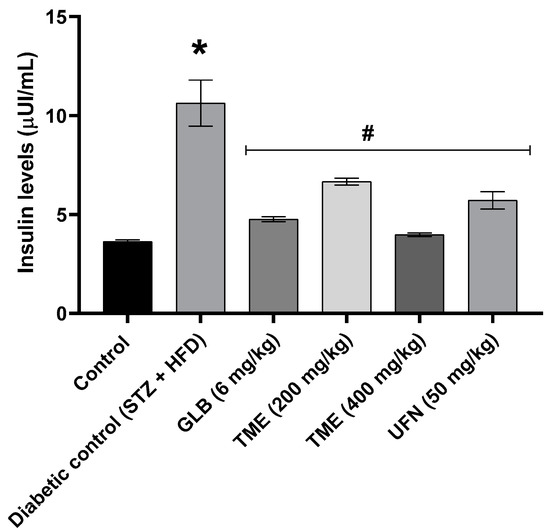 Effect of TME (200 and 400 mg/kg) of B. eriophora and isolated UFN on fasting insulin levels. Values are represented as mean ± SD, n = 3. * represents a significant difference between the control group and the diabetic control group (STZ + HFD). Whereas # represents a significant difference between the diabetic control group with all the treatment groups of TME and UFN. HDL; high-density lipoprotein, STZ; streptozotocin, STD GLB; standard glibenclamide, TME; total methanol extract, UFN; Umbelliferone.