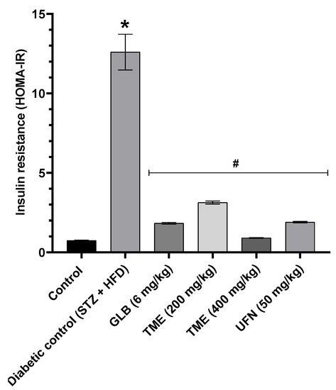 Results showed that serum insulin level was significantly (p < 0.001) increased after 3 weeks of treatment amongst the diabetic control (STZ + HFD) rats, as shown in Figure 4. However, treatment with TME (200 and 400 mg/kg) and UFN (50 mg/kg) reduced serum insulin levels significantly (p < 0.001) compared to the diabetic control group. In addition, treatment with TME (200 and 400 mg/kg) also improved insulin sensitivity significantly (p < 0.001) by decreasing Homeostatic Model Assessment-Insulin Resistance (HOMR-IR) in the treated rats as shown in Figure 5. Moreover, results revealed that TME acted in a dose-dependent manner. In addition, 400 mg/kg of TME effect on fasting insulin level showed no significant difference when compared with STD GLB, an insulin secretagogue. The lower dose of TME appeared to have a similar effect on insulin secretion compared to UFN, as shown in Figure 4.
