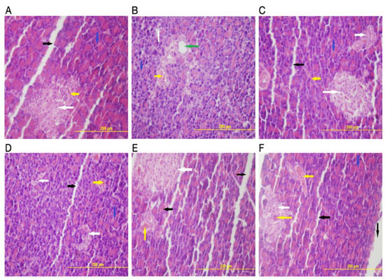 Photomicrographs of pancreatic tissue of controls and treated experimental animals. (A) The control group showed a healthy islet of Langerhans (endocrine cells) (white arrow), a compact glandular cells-exocrine portion with basal nuclei (blue arrow), and blood vessels (yellow arrow). (B) Diabetic group (STZ + HFD) showing damaged endocrine cells (white arrow), enlarged interlobular duct (green arrow), disturbed glandular cells with dilated interlobular blood vessels (yellow arrow) and perilobular fibrosis (blue arrow). (C) STD GLB group showing recovered endocrine cells (white arrow), with blue arrows indicating near-normal glandular cells and black arrows showing intralobular duct. (D) Treatment with 200 mg/kg TME showed recovering endocrine cells still having perilobular fibrosis, but not as the diabetic control group. (E) represents 400 mg/kg TME with recovered endocrine cells (white arrow), and blood vessels (yellow arrow) with a near-normal intralobular duct. (F) shows treatment effects with UFN closely similar to that produced by 400 mg/kg of TME treatment. H&E ×400. STZ; streptozotocin HFD; high-fat diet, STD GLB; standard glibenclamide, TME; total methanol extract, UFN; umbelliferone.