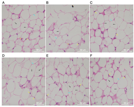 Photomicrographs of adipose tissue of controls and treated experimental animals. (A) The control group showed polygonal fat cells (black arrow) with a nucleus (yellow arrow) and distinct polygonal-shaped cells (light blue arrow). (B) The diabetic control group showed large-sized polygonal fat cells (black arrow) with scattered nuclei (yellow arrow) and distorted fat cells outlines (light blue arrow). (C) Showing recovered fat cells near to normal with GLB treatment. (D) Showing recovering adipose tissue fat cells with few nuclei and distorted polygonal fat cells after treatment with 200 mg/kg TME. (E) Shows apparent improved polygonal fat cells (black arrow) with well-shaped cellular outlines (light blue arrow). (F) Represents treatment with UFN also showing recovered adipose tissue fat cells (black arrow) with defined cellular outlines (blue arrow) but not as distinct as in the diabetic control group. H&E, ×1000. STZ; streptozotocin HFD; high-fat diet, STD GLB; standard glibenclamide, TME; total methanol extract, UFN; umbelliferone.