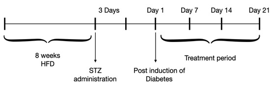 Following 8 weeks of HFD, the 30 animals were divided into five groups as shown in Table 3. Then, overnight-fasted animals were administered intraperitoneally (i.p.) with a single dose of 40 mg/kg STZ, prepared in a 0.1 M cold citrate buffer (pH 4.5), and monitored for 3 days as previously described [67,68,69]. A blood glucose level of > 250 mg/dL was confirmed as a state of hyperglycemia. The respective treatments of the different five diabetic groups were for 21 days as shown in Figure 8. Dosages were chosen according to previous experiments using TME of plants [23,70].