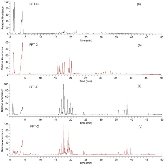The total ion chromatograms of flower (FFT-2) and bulb (BFT-B) of F. thunbergii under negative (a,b) and positive (c,d) ion mode.